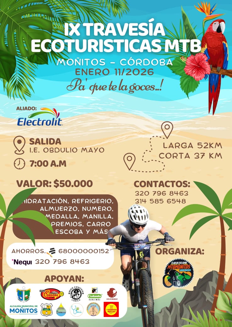 11 Enero 2026 / Moñitos9na Travesia Ecoturistica MTBPa’ que te la gocesInscribirse Acerca del EventoDescubre la 9na Travesia EcoturísticaDisfruta de competencias emocionantes en terrenos desafiantes y pintorescos de Moñitos. Ambiente seguro y competitivo con organización experta. +15 Lugares Icónicos × ❮ ❯ +7 Puntos de Hidratación Lugares destacados PaisajesTravesia de moñitos sin paisajes no es posible Moñitos Paraíso Tropical Ven y deléitate con nuestros atendeceres de película. Entre Montañas Nuestra travesía es reconocida por sus paisajes entre montañas y naturaleza indomable. Muelle TuristicoEn este lugar podras ver las hermosas playas del municio. Momentos MemorablesRevive los Momentos Más Espectaculares Reserva AHORA¡No te Pierdas la Oportunidad de Participar en la Emoción del MTB Moñitos!Asegura tu lugar en esta emocionante competencia y vive una experiencia inolvidable en medio de la naturaleza.INSCRIBIRSE Formulario de Inscripción Nombres * Apellidos * Ciudad * Club Cédula * EPS * Grupo Sanguíneo * Seleccione... A+ A- B+ B- AB+ AB- O+ O- Correo Electrónico * Número de Teléfono * Comprobante de Pago *